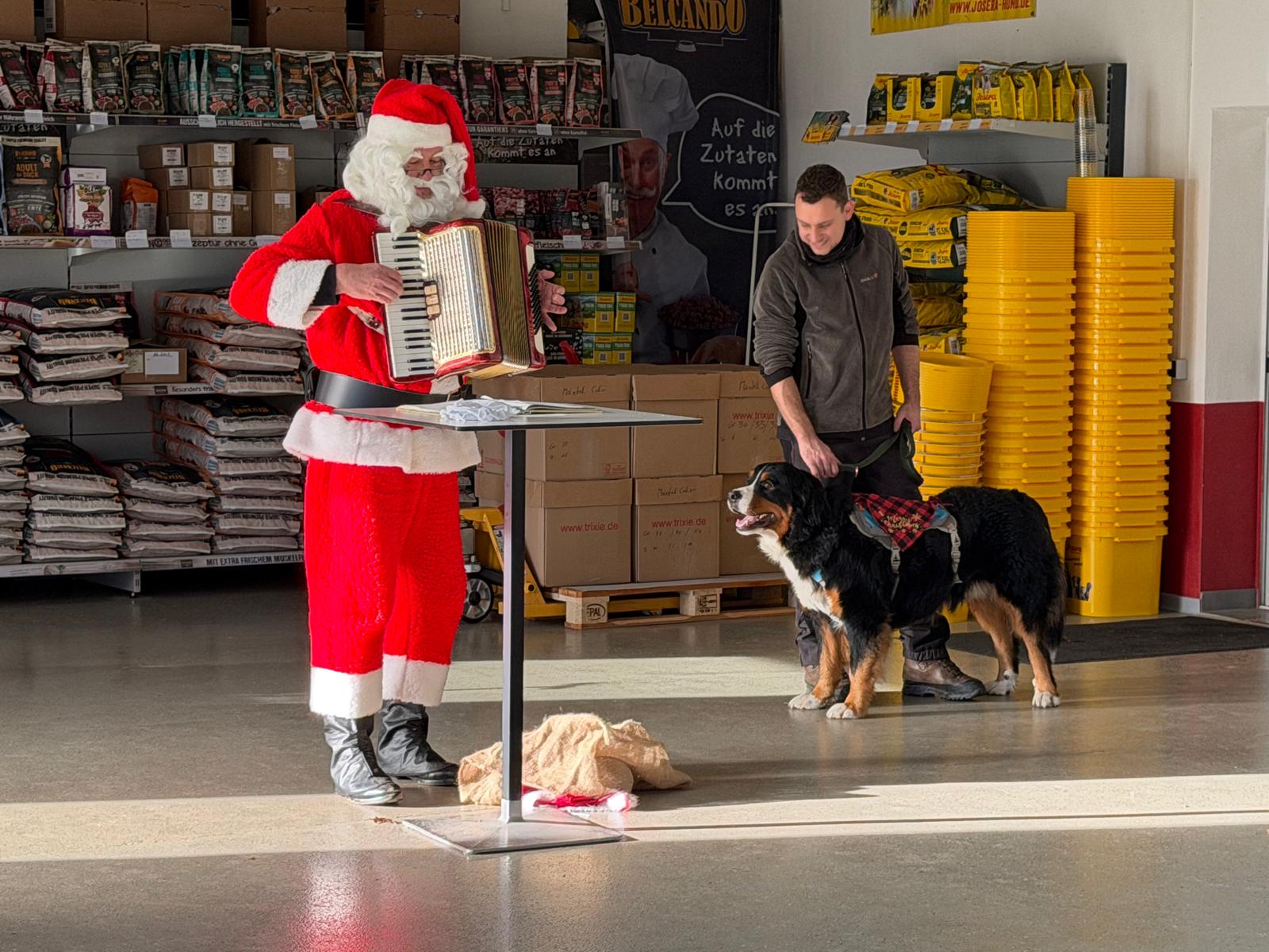 Auf einer wunderschönen und abwechslungsreichen Strecke von 5,5 Km lief unsere Gruppe mit 36 Hunden und 53 Personen harmonisch durch die Weinberge und den umliegenden Wald. Auf einer großen Wiese konnten die Hunde zwischendurch toben und spielen. Am Ende trafen wir uns alle in der Trainingshalle zum alljährlichen Jahresausklang. Bei Glühwein und Würstchen lies es sich gemütlich plaudern. Unser Highlight kam aber zum Schluss. Besuch vom Nikolaus und seinem Knecht Ruprecht Fiete. Mit einem Resümee des Hundeschuljahres 2025, einem Gedicht und einem gemeinsam gesungen Lied unter Begleitung seines Akkordeons waren alle seelisch auf Weihnachten eingestellt. Vielen Dank lieber Nikolaus für Deinen Besuch. Ich könnte schwören, Du bist der Echte! :-) – Zum Beweis gibts hier die Bilder