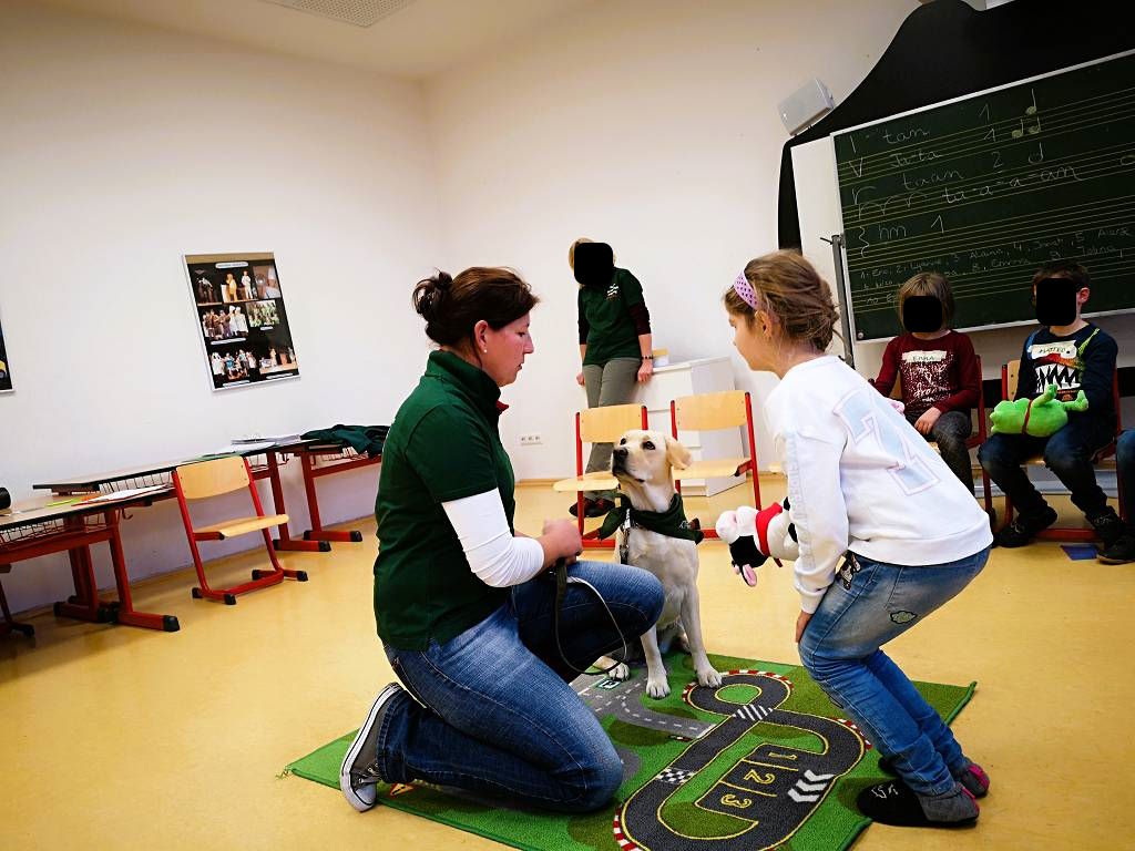 Die Schulbesuchshunde werden als Ergänzung zum Unterricht von Erziehern, Fachkräften und Integrationskräften im nicht regulären Schuldienst eingesetzt. Ihre intensive Ausbildungszeit beträgt 9 Monate. Sie werden im punktuellen Einsatz und mit Publikumswechsel in den Unterricht integriert. Der Schulbesuchshund kann vielseitig eingesetzt werden, z.B: als Kitahund, Lesehund oder AG-Hund in Kindertagesstätten oder in Schulen. Dabei kann er aktiv in den Unterricht miteinbezogen werden. Durch seinen Einsatz können Kinder behutsam an das Thema Hund herangeführt werden und eigene Erfahrungen im positiven Umgang mit einem Haustier sammeln. Mithilfe der tiergestützten Aktivität sollen Kinder und Jugendliche sozial und emotional gefestigt werden.